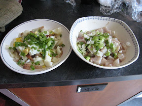 Aging red potatoes, finally cleaned and chopped up -- half for salad, half for some other quickie dish: